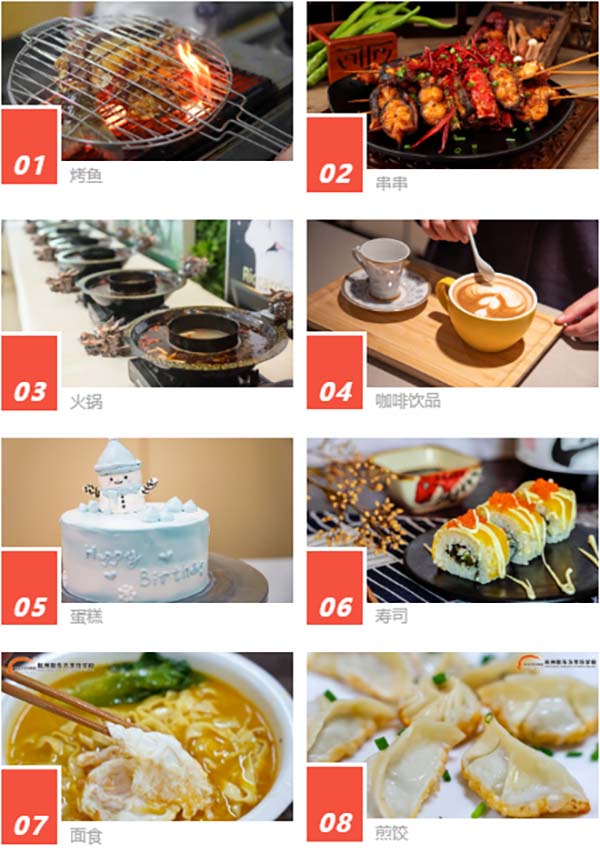 學習品種多元化:烤魚、火鍋串串、燒烤、咖啡飲品、小龍蝦、涼菜、熱菜、蛋糕、裱花、烤鴨、麻辣燙、壽司、面食、早餐等,應有盡有!