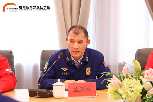 典禮伊始,杭州新東方烹飪學校校區(qū)負責人陳小進主任首先致辭。他強調(diào),此次培訓聚焦實戰(zhàn)需求,結(jié)合消防救援隊伍任務特點,精心設計了涵蓋熱菜烹飪、面點制作、刀工技法、勺工技法等核心課程,旨在通過“理論+實操”雙軌教學,幫助學員系統(tǒng)掌握營養(yǎng)搭配、菜品創(chuàng)新及應急供餐能力。陳小進表示,學校將全力調(diào)配專業(yè)師資,確保培訓成效。