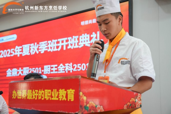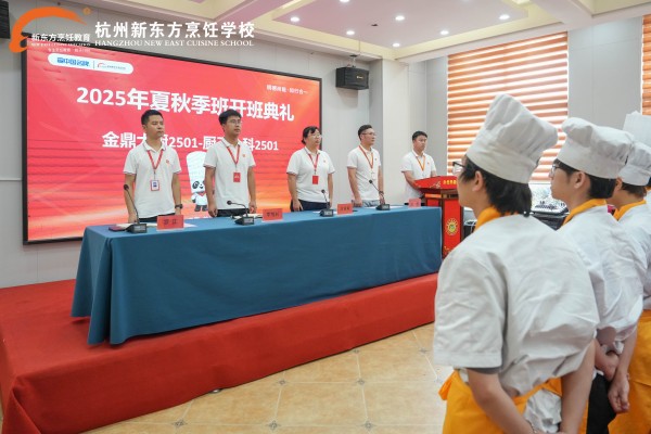 當清晨的陽光灑滿校園,當青春的朝氣撞進夢想的懷抱,杭州新東方烹飪學校金鼎大廚2501班、廚王全科2501班的同學們齊聚一堂,在校區(qū)主任陳小進、考試考證中心主任羅江、教務(wù)處主任段寅寅、學生處主任季旭科等校領(lǐng)導的見證下,共同按下“新征程啟動鍵”。