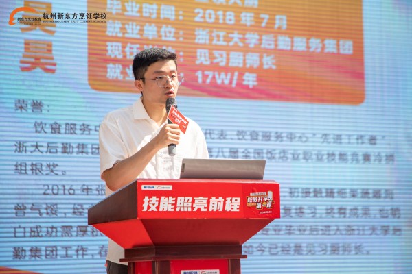 本次活動,已經(jīng)畢業(yè)的學(xué)長張昊昊也來到了活動現(xiàn)場,現(xiàn)任浙江大學(xué)后勤食堂見習(xí)廚師長的他,回顧了自己在杭州新東方的學(xué)習(xí)時光,分享了從烹飪新手到獨當(dāng)一面的成長故事。他告訴同學(xué)們,選擇杭州新東方,就是選擇擁抱烹飪藝術(shù)、錘煉匠心、開啟無限可能的未來,希望大家以歸零心態(tài)、勇于嘗試的精神和對烹飪的熱愛,在校園里收獲成長。